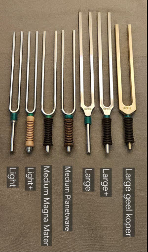 Vanaf 2026 leverbaar in steeds meer frequenties: stemvorken in Geel Koper (messing). Prachtige exemplaren met een gouden uitstraling. Het formaat komt het dichtst bij de Large, maar deze koperen zijn wat korter en dikker: heel robuust. Ze klinken prachtig. Ze hebben een heel warme klank en klinken erg lang door. Koper hoort astrologisch gezien bij Venus, en deze energie dragen ze dan ook allemaal een beetje met zich mee. Zacht, harmoniserend en rustgevend.