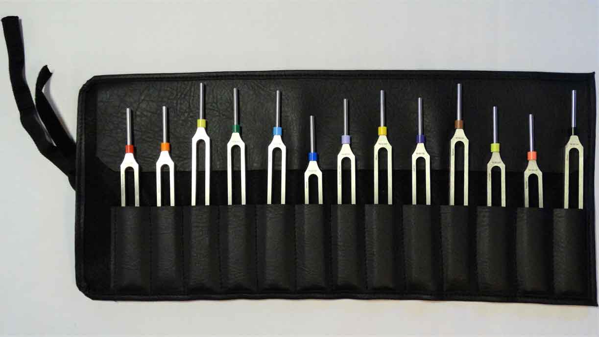 Large. Deze set zit in een groot kunstleren etui en bestaat uit 13 stemvorken. Wordt geleverd met een opzetstukje dat je onder de stemvorken kunt bevestigen voor extra prettig werken op de huid. Wordt indien gewenst geleverd met een overzichtskaart met frequenties en korte aanduiding van de werking.